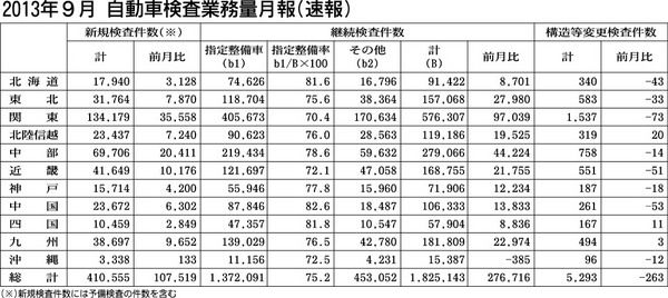 国土交通省は、9月の自動車検査業務量(速報)をまとめた。それによると、新規検査件数は前年同月比3万6370件増の41万555件、継続検査件数は同5万2410件増の182万5143件。構造等変更検査件数は同74件減の5293件。指定整備率は...