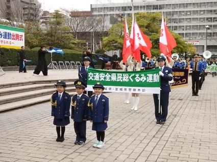 ○…新1年生の先導で出発―。宮城県と宮城県警察本部は6日、仙台市青葉区の勾当台公園で「2018年春の交通安全県民総ぐるみ運動出発式」を実施した。宮城県交通安全対策協議会や宮城県レンタカー協会などの関係団体、県民など約500人と、白バイ、パ...