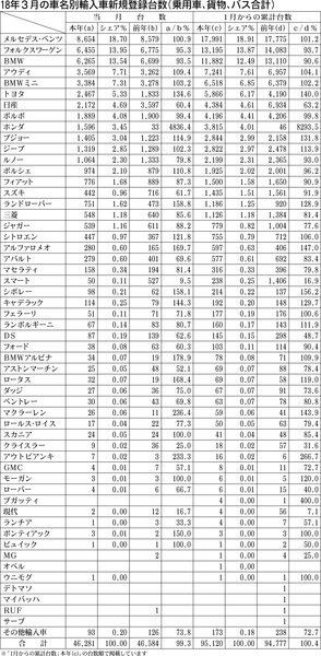 18年3月の車名別輸入車新規登録台数は、首位のメルセデス・ベンツがわずかながらプラスを確保したものの、2位のフォルクスワーゲン、3位のBMWは減少した。4位のアウディは2桁近い伸びで、続くBMWミニも増加した。この他ではプジョー、ポルシェ...