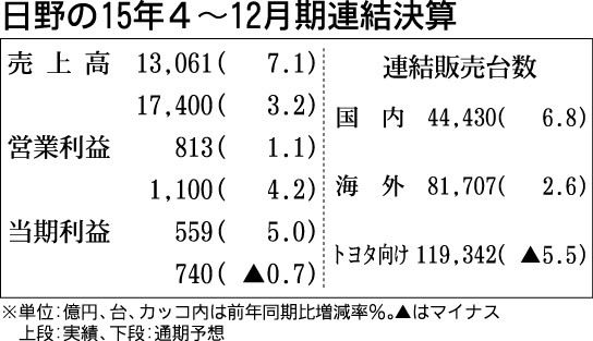 日野自動車が29日に発表した2015年4~12月期の連結決算は増収増益で、売上高は第3四半期として過去最高となった。国内市場が好調に推移していることに加えて、北米や中近東での販売増加が寄与した。 グローバル販売台数は、前年同期比0・3%減...