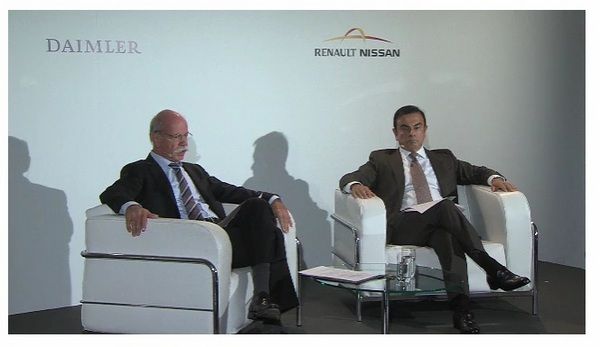 ルノー・日産アライアンスのCEO(最高経営責任者)のカルロス・ゴーン日産自動車社長と独ダイムラーAGのディーター・ツェッチェ取締役会会長は28日、フランス・パリ市内で開催中の「パリモーターショー」の会場内で記者会見し、仏ルノー、日産、ダイ...