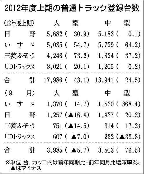 業界筋がまとめた上期の普通トラック(積載量4トン級以上)販売は前年同期比34・4%増の3万1927台だった。エコカー補助金や復興需要が上期のトラック需要を下支えしたことで中・大型ともに前年実績を上回った。 上期のメーカー別販売台数は日野自...