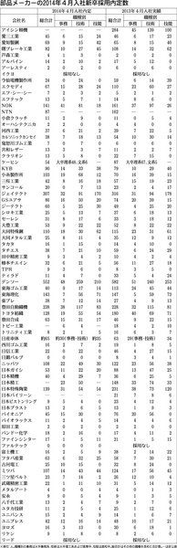 日刊自動車新聞社がまとめた部品メーカーの2014年度新卒採用状況(14年春入社、調査は10月下旬に実施)によると、上場部品メーカー73社の新卒内定者数は3682人と、13年度(13年春入社)実績を14・2%下回った。生産現場の技能系職種の...