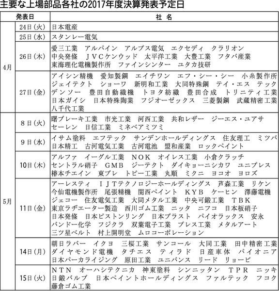 【主要な上場部品各社の2017年度決算発表予定日】