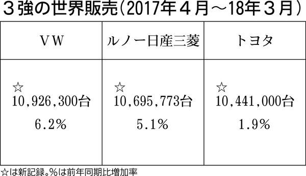 “1千万台クラブ”3強の2017年4月~18年3月の世界販売は、そろって新記録となった。フォルクスワーゲン(VW)グループは1100万台に迫る1092万6300台で首位をキープ。ルノー日産三菱連合は、17暦年に続き2番手につけた。トヨタグ...