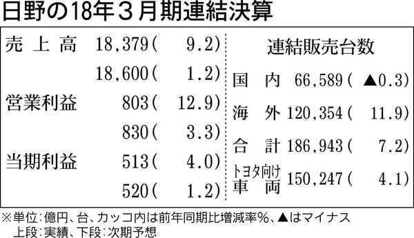 日野自動車は26日、2019年3月期の業績が2期連続の増収増益になる見通しを発表した。円高が減益要因になるものの、販売台数が主に海外で増加することにより、日野として初めて20万台を超える。 下義生社長は「18年度は為替差損を営業努力や合理...