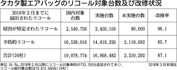 国土交通省は、タカタ製エアバッグの改修状況を公表した。3月末時点での改修率は88・4%。原因が特定されたリコールに限ると改修率は96・4%に高まった。2月以降に約73万台分の届け出があり、総対象台数は延べ1981万2566台になった。...