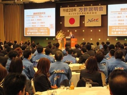 ネッツトヨタ浜松(竹山英夫社長)は1月25日、「平成28年方針説明会」を浜松市内のホテルで開催した。新車・中古車販売と整備事業売上高の「2016年がんばる目標」を発表し、出席した同社の従業員ら約440人が目標達成に向けて決意を新たにした。...