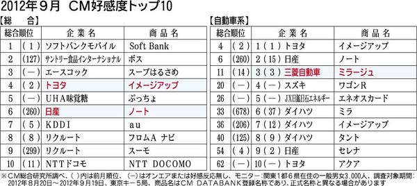 CM総合研究所(関根建男代表)がまとめた9月のCM好感度ランキングは、ソフトバンクモバイルが10カ月連続で1位。トヨタ自動車の「イメージアップCM」は総合4位。日産自動車の「ノート」が同じく6位となった。日産としては先月の「セレナ」に続き...