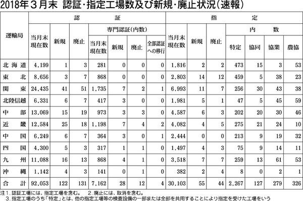 国土交通省は、2018年3月末時点の認証・指定工場数と新規・廃止状況をまとめた。認証工場は前月比11件減の9万2053工場。指定工場数は11件増の3万103工場となり、2カ月連続で増加した。専門認証工場数も12件増の7162工場となった。...