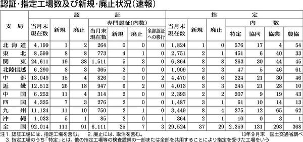 国土交通省は2013年9月末時点での認証・指定工場数及び新規・廃止状況をまとめた。認証工場数は前月比20件増の9万2014工場で3カ月連続で増加した。指定工場数は同8件増の2万9524工場。専門認証工場数は同15件増の6111工場で2カ月...