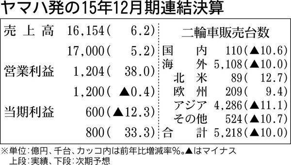 ヤマハ発動機が9日発表した2015年12月期の連結決算は、先進国での二輪車販売の増加やマリン事業の好調などにより、3期連続で増収増益となった。当期利益は米国子会社での法人税の費用増や繰延税金資産の追加計上により減益となった。 主力の二輪車...
