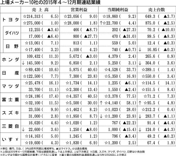 国内自動車メーカー上場10社の2015年4~12月期連結決算が10日、出そろった。好調な北米市場を中心とした高水準な販売に加え、コスト改善や原油安など原材料市況もプラスに働いた。通期見通しは、地政学的リスクの高まりもあり4社が売上台数を下...