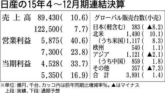 日産自動車が10日発表した2015年4~12月期連結業績は、北米と西欧の新車販売が好調だったことから当期純利益が前年同期比33・7%増の4528億円と4期連続増益で過去最高となった。 4~12月期のグローバル販売台数は、同1・4%増の38...