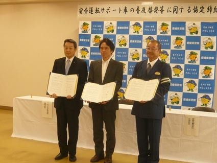 【松山】日本自動車販売協会連合会愛媛県支部(岡豊支部長)と日本自動車連盟(JAF)愛媛支部(同支部長)は8日、愛媛警察本部(松下整本部長)と安全運転サポート車(サポカー)の普及促進に関する協定書を結んだ。サポカー普及に弾みをつけ、県内交通...