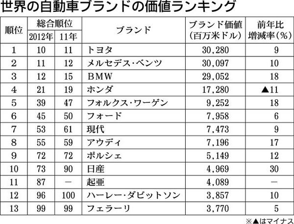 自動車メーカーの企業や製品が持っているブランド価値の向上に新興国市場での販売台数の伸びが大きく寄与している。インターブランドジャパン(岩下充志社長CEO、東京都千代田区)が発表した「ベストグローバルブランド2012」ランキングは、安定した...