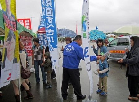 【帯広】日本自動車連盟(JAF)帯広支部(若林剛支部長)は、地域イベント「みのりーむフェスタ」の会場で自動車取得税などの廃止を訴えた。 自動車諸税是正キャンペーンの一環として、アグリアリーナで開かれた物産展で実施。時折り小雨が降るあいにく...