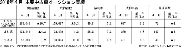 4月の主要中古車オークション(AA)実績のうち出品台数は前年同月比9・2%減の約47万台となった。中古車の登録台数、新車登録台数ともに前年同月比を上回ったが、AAの出品台数は減少した。対象会社は、ユー・エス・エス(USS、JAAとHAA神...
