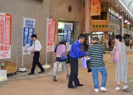 【鹿児島】日本自動車連盟(JAF)鹿児島支部(福石堅郎支部長)はこのほど、鹿児島市金生町の繁華街・天文館中通りで「平成26年度 税制改正に関する街頭活動」を実施した。「自動車ユーザーだけが、税金を余分に負担することは不公平である」などと訴...