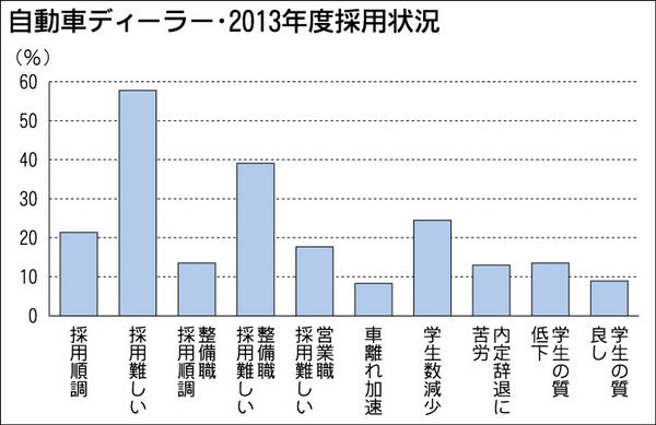 日刊自動車新聞社は、全国の自動車販売会社を対象に「ディーラー採用アンケート調査」を実施した。2013年度(14年4月入社)の採用状況について回答を分析してみると「採用が難しかった」とする回答が半数を超えて、6割近くになった。とくに「整備職...