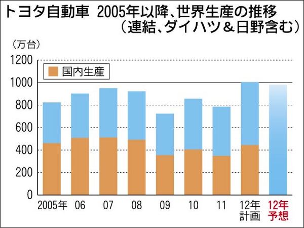 トヨタ自動車の2012年の世界生産(ダイハツ工業、日野自動車含む)が従来予想した年1千万台強を下回る見通しとなった。反日デモによる中国生産の減少を受け、10月の現地生産が前年同期に対して半減、11、12月が3割減で推移することを前提として...