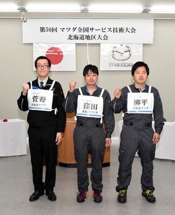 「第50回マツダ全国サービス技術大会 北海道地区大会」(主催=全国マツダ販売店協会、マツダ)が12日、北海道マツダ菊水研修センターで開かれた。北海道マツダから2組と函館マツダ1組が参加、学科と実技でサービスの腕を競った。北海道マツダAチー...