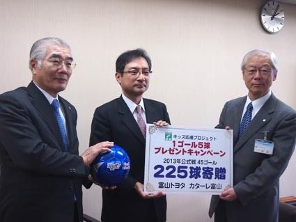 【富山】富山トヨタ(品川祐一郎社長)が8月から開始した地元サッカーチーム「カターレ富山」の獲得ゴール数に応じて県内小学校へサッカーボールを寄贈する「1ゴール5球プレゼントキャンペーン」の寄贈式が11月28日、富山市役所で行われた。今季のカ...