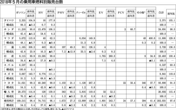 日本自動車販売協会連合会がまとめた5月の乗用車燃料別販売台数によると、ガソリン車とハイブリッド車(HV)、プラグインハイブリッド車(PHV)が前年実績を下回った。一方で電気自動車(EV)は前年同月比で2・4倍と大幅に販売台数を伸ばした。E...