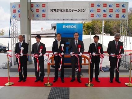 JXエネルギーは24日、大阪府茨木市に開設した「枚方走谷水素ステーション」の開所式を開いた。 来賓として、市原秋男経済産業省近畿経済産業局資源エネルギー環境部長や下村善嗣大阪府商工労働部成長産業振興室新エネルギー産業課長、伏見隆枚方市長ら...