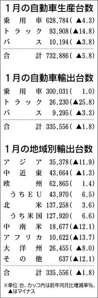 1月の四輪車国内生産と輸出 国内生産5.8%減
