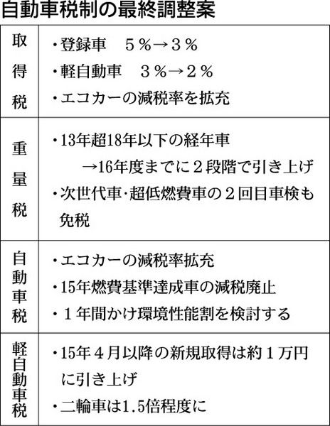 自民党税制調査会(野田毅会長)は11日、車体課税の改正案をまとめた。自動車取得税は来年4月から登録車(排気量660cc超)で2%、軽自動車で1%、それぞれ引き下げたうえでエコカー減税幅を上乗せする。自動車重量税はハイブリッド車などに限り2...