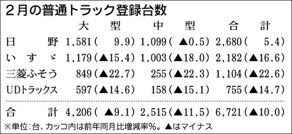 業界筋がまとめた2月の普通トラック(積載量4トン以上)販売は、前年同月比10・0%減の6721台と4カ月連続で減少した。大型トラックが9・1%減の4206台で2カ月ぶりのマイナス、中型トラックが11・5%減の2515台で8カ月連続のマイナ...