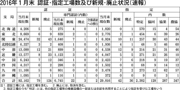 国土交通省は2016年1月末時点の認証・指定工場数および新規・廃止状況をまとめた。 認証工場数は前月比45件減の9万2162件で、3カ月ぶりに減少した。指定工場数は6件増の2万9816件となり、8カ月連続で増加した。専門認証工場数は、17...