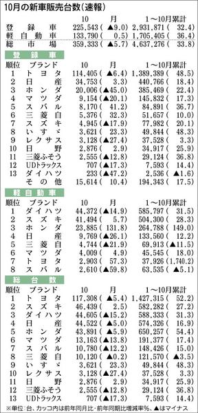 日本自動車販売協会連合会(自販連)、全国軽自動車協会連合会(全軽自協)が1日発表した10月の新車販売台数は前年同月比5・7%減の35万9333台だった。2カ月連続の減少で、エコカー補助金終了後の反動減が継続している格好だ。2カ月連続減の登...