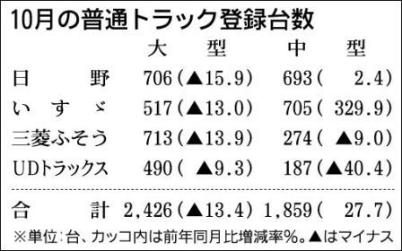 業界筋がまとめた10月の普通トラック(積載量4トン以上)販売は前年同月比0・7%増の4285台だった。前年実績超えは2カ月連続。大型車は3カ月連続で減少したものの、中型車が2カ月連続の増加となったことで微増を確保した。普通トラック販売は今...