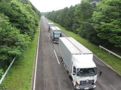 経済産業省と国土交通省は28日、後続車が無人のトラック隊列走行の実証実験を産業技術総合研究所つくばセンターつくば北サイト(茨城県つくば市)で報道陣に初めて公開した。3台のトラックが約10メートル間隔で走行し、後続2台が車車間通信(V2V)...