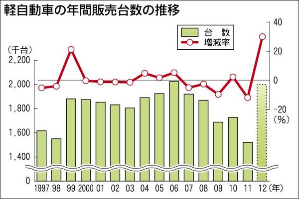 軽自動車の年間販売台数(暦年)が200万台の大台を突破する可能性が出てきた。2012年1~10月の累計販売台数は170万台を超えており、仮に11月と12月が前年実績並みになると仮定すると、年間では約197万6千台に到達する。それだけでも過...