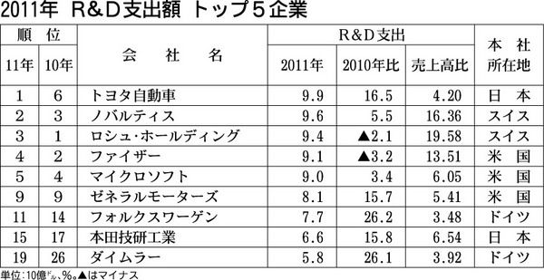 経営コンサルティング会社のブーズ・アンド・カンパニー(今井俊哉社長、東京都港区)は、「グローバル・イノベーション調査」結果を公表した。これによるとトヨタ自動車が世界企業1千社の中で研究開発(R&D)支出額がトップとなった。トヨタの2011...
