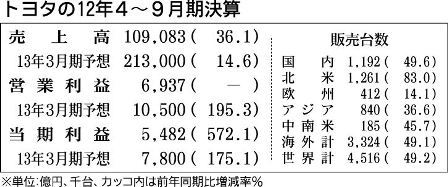 トヨタ自動車は5日、2013年3月期の連結業績予想(米国会計基準)を修正して発表した。売上高は5月8日に発表した前回予想に対して7千億円減の21兆3千億円、営業利益は500億円増の1兆5百億円に変更した。減収予想には中国の販売減や為替想定...