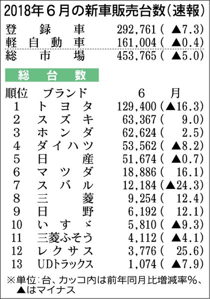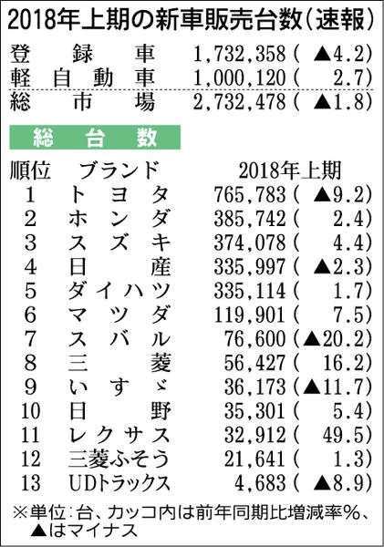 2018年上期(1~6月)の新車販売台数は前年同期比1・8%減の273万2478台となり、2年ぶりに前年実績割れとなった。登録車を中心に前年の販売実績が好調であったため、反動減でマイナスに転じた格好だ。登録車は4・2%減の173万2358...