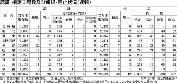 国土交通省は2013年10月末時点での認証・指定工場数及び新規・廃止状況をまとめた。認証工場数は前月比43件増の9万2057工場で4カ月連続で増加した。指定工場数は前月と同じ2万9524工場。専門認証工場数は同28件増の6139工場で3カ...