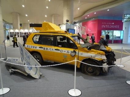 震災を物語る道路パトロールカー、防災への心がけ喚起