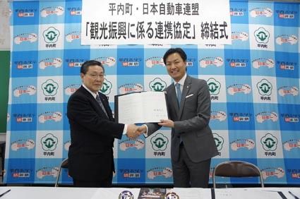 【青森】日本自動車連盟(JAF)青森支部(小野大介支部長)と青森県平内町(船橋茂久町長)はこのほど、「観光振興に係る連携協定」を締結した。平内町勤労青少年ホームで締結式を実施、小野支部長と船橋町長が協定書に署名を行った。JAF青森では、平...