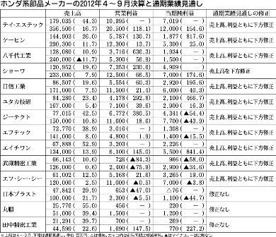 ホンダ系部品メーカー14社の2012年度業績は、震災やタイの洪水の影響を大きく受けた11年度に比べ大幅に改善するものの、新興国での金融引き締め、中国での日本車不買の影響などにより改善幅は当初見通しを下回る見通しだ。4~9月決算では14社中...