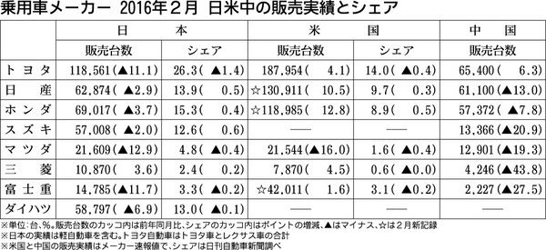 日本の乗用車メーカー2月、米市場で3社が新記録/中国は春節で軒並み減