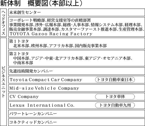 トヨタ自動車が4月18日付で、七つのカンパニー制を軸とする大掛かりな組織変更を実施する。これまで技術や生産など機能別に分かれていた組織を一新。車両のクラス別などでクルマづくりの始まりから終わりまで、各カンパニーが一貫して手掛ける製品別組織...