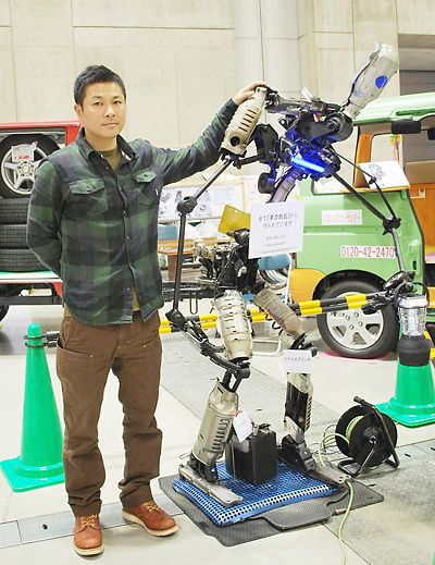 ○:何やら人のかたちをしたロボットと一緒にポーズをとる男性の姿。実はこのロボット、かかしをモチーフに車の廃棄パーツ約60点を使用し制作されたもの。制作者は隣の男性で山形県自動車販売店リサイクルセンター(遠藤栄次郎社長)に勤務する布施靖さん...