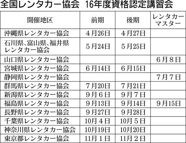 全国レンタカー協会(縄野克彦会長)が新たに実施する「レンタカーマスター」の資格認定講習会が国土交通省の後援を受けることが決まった。6月から講習会と試験を開始する。レンタカー業界は、着実に車両数を伸ばしており、今後の発展も期待できる。そのた...