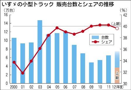 いすゞ自動車は、小型トラック市場でシェア40%堅持を目指す。同社は2011年度まで3年連続でシェア40%を超えていたが、今年度上期(4~9月)は39・6%と、小幅ながら40%を割り込んでいる。特に、営業用(緑ナンバー)に比べてシェアが低い...