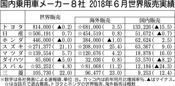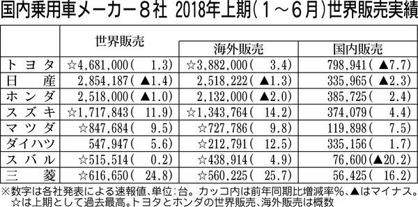 乗用車メーカー8社が27日発表した2018年上期(1~6月)の世界販売実績は、トヨタ自動車、スズキ、マツダ、スバル、三菱自動車の5社が上期として過去最高だった。主要各国で新型車の投入効果や需要が高い車種の供給改善などを図ったことなどで海外...